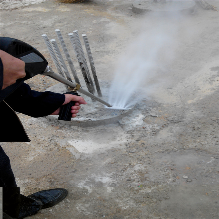 在我國南方一些地區(qū)地下十幾米后的土都比較松軟,在進行樁柱橋墩施工時,由于土質(zhì)松散往往會導致樁柱下沉。我們只有通過將樁柱底部的松散泥土和一些碎石沖洗出來,然后再進行注漿即可加固樁柱地基,保證樁柱不會下沉。而樁柱的長度一般有20米到50米之間,在這么長的距離上如何透過混凝土的樁柱將底層的泥土、碎石沖洗出來呢?首先我們將樁柱上邊打兩到四個100mm的孔通過樁柱底部,然后將沖毛機產(chǎn)生的高壓水射流送入樁柱底部地基處,通過沖毛機產(chǎn)生的50Mpa的水射流將樁柱底部的泥土和碎石沖洗開,然后用9立方以上的空壓機將樁柱底部碎石和泥土吹出來。然后再進行樁柱底部注漿,樁柱上邊的100mm的孔也要加工字鋼后注漿。這樣既可利用沖毛機加固樁柱在軟弱混凝土處的地基,保證樁柱不會下沉。